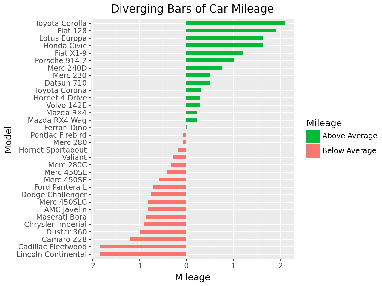 + labs(title="Diverging Bars of Car Mileage", x="Model", y="Mileage")
