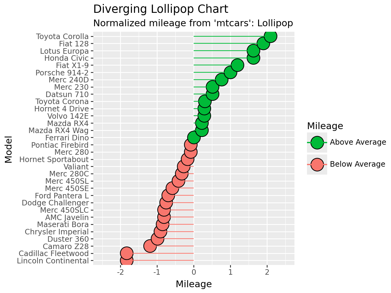 subtitle="Normalized mileage from 'mtcars': Lollipop",