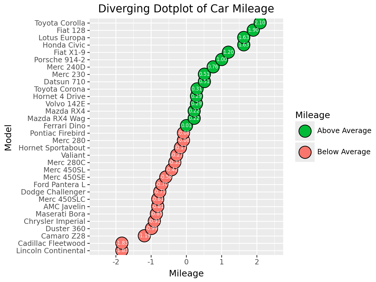 + labs(title="Diverging Dotplot of Car Mileage", x="Model", y="Mileage")